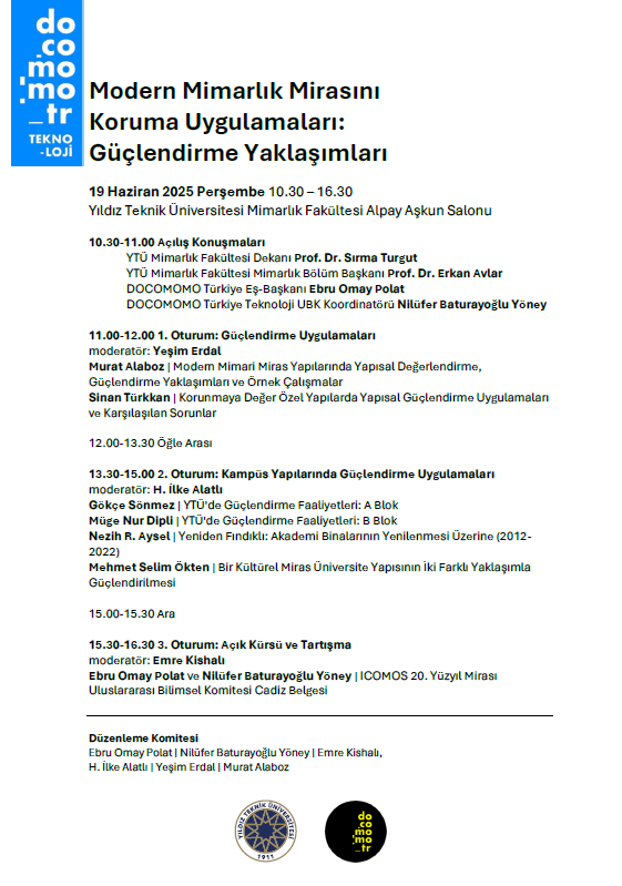 Bu konferansların ilki Modern Mimarlık Mirasını Koruma Uygulamaları: Güçlendirme Yaklaşımları başlığıyla 19 Haziran 2025 Perşembe günü 10.30 – 16.30 saatleri arasında Yıldız Teknik Üniversitesi Mimarlık Fakültesi Alpay Aşkun Salonu’nda yüz yüze gerçekleştirilecektir. Türkiye Modern Mimarlık Mirasının büyük bölümünü oluşturan betonarme yapıların güçlendirilerek sürdürülebilir biçimde geleceğe aktarılmasına odaklanan konferans kapsamında ayrıca beton ve betonarme içerikli kültür mirasını ele alan 2021 tarihli ICOMOS 20. Yüzyıl Mirası Uluslararası Bilimsel Komitesi Cadiz Belgesi tanıtılacaktır.